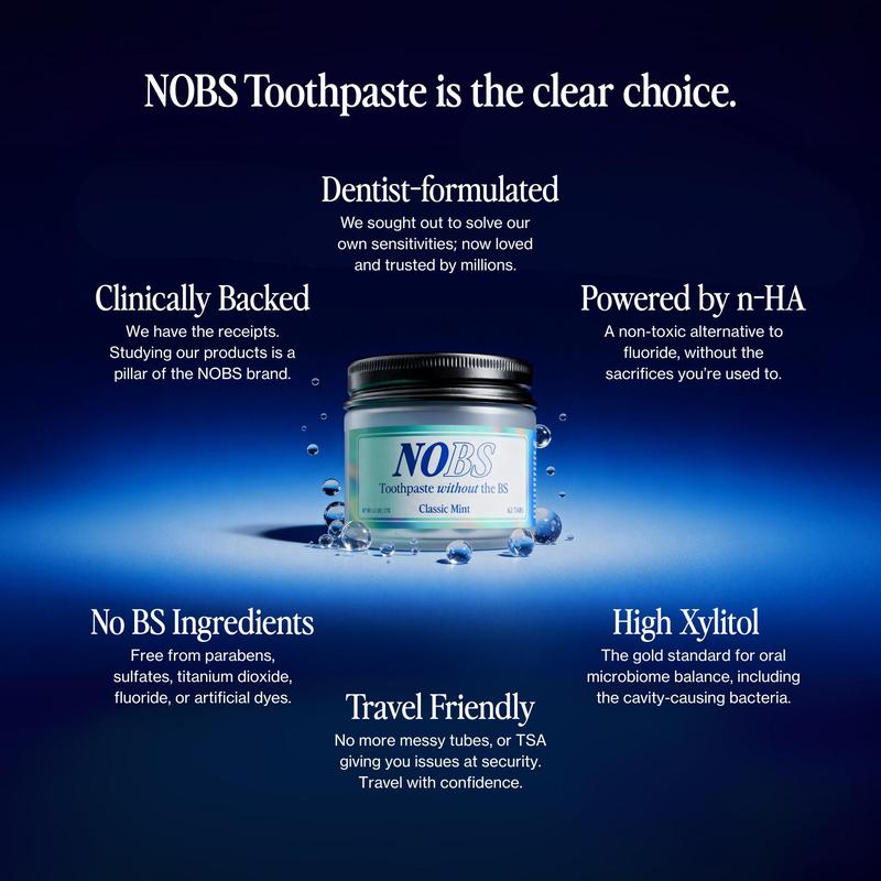 NOBS: Clean, effective, and mess-free. These nano-hydroxyapatite toothpaste tablets are a smarter alternative to fluoride — restoring enamel, polishing teeth, and freshening breath without harsh ingredients. Safe for kids who can chew, perfect for travel, and packaged plastic-free in a sleek glass jar.