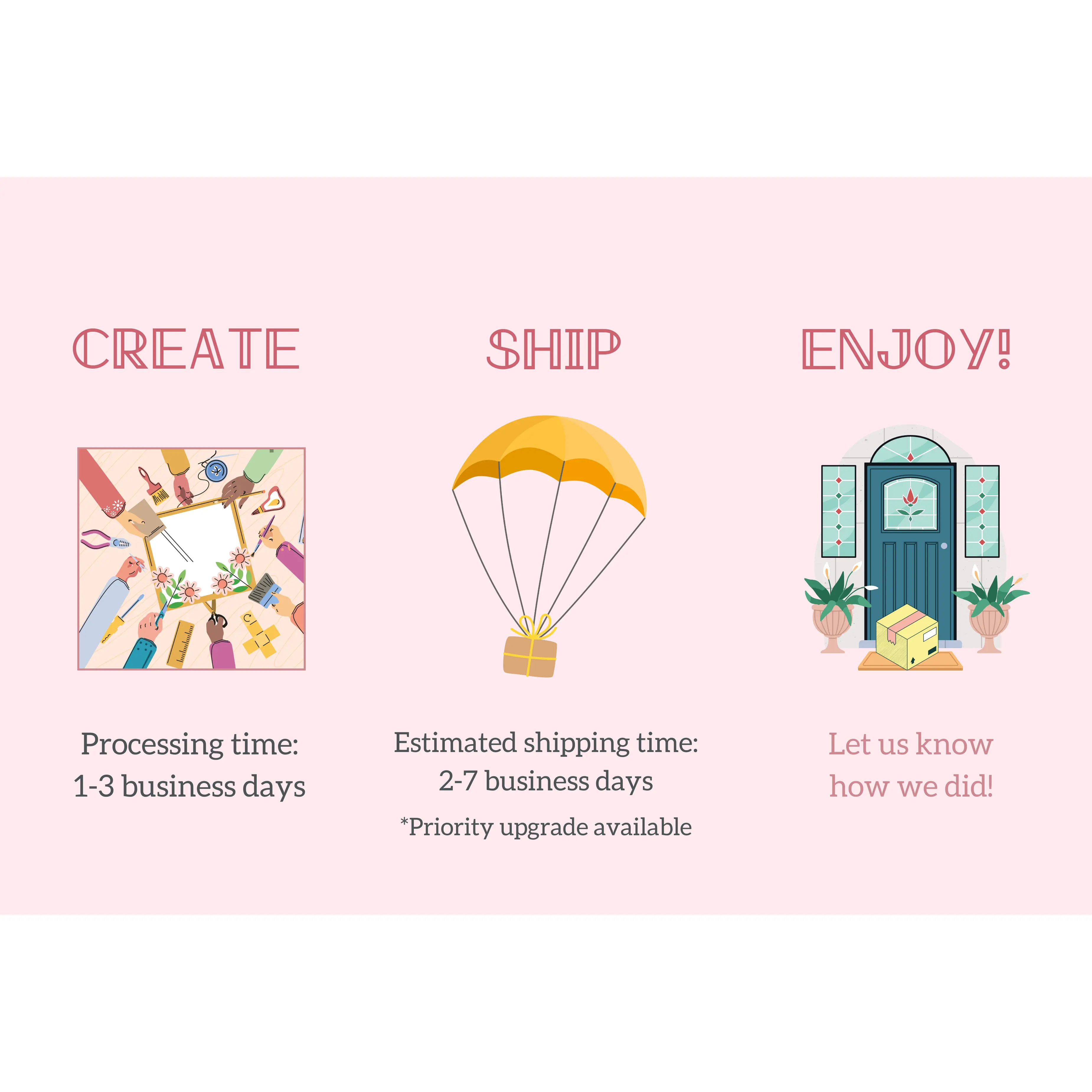 Orders are shipped within 1-3 business days. Shipping generally takes about 2-7 business days, though Priority Mail upgrades are available at an additional charge.