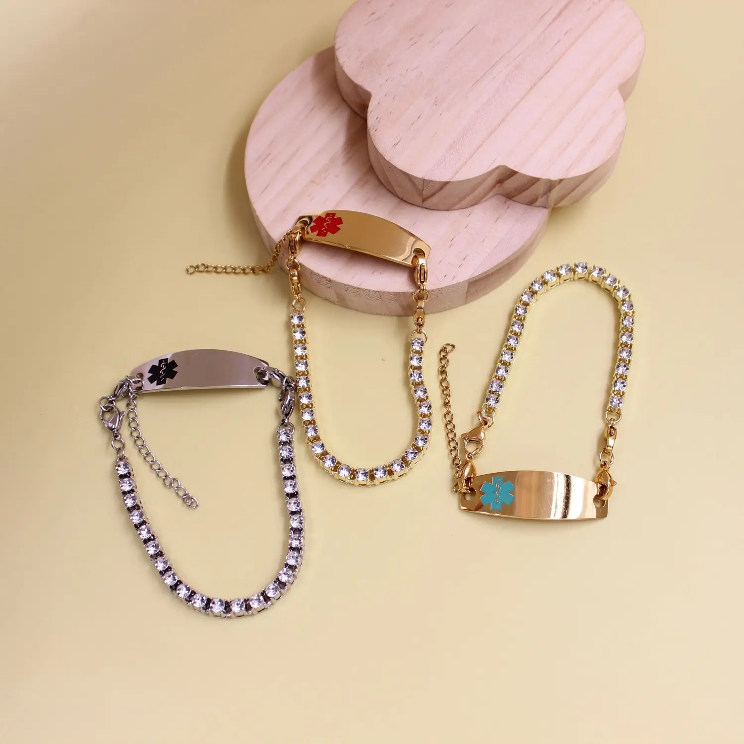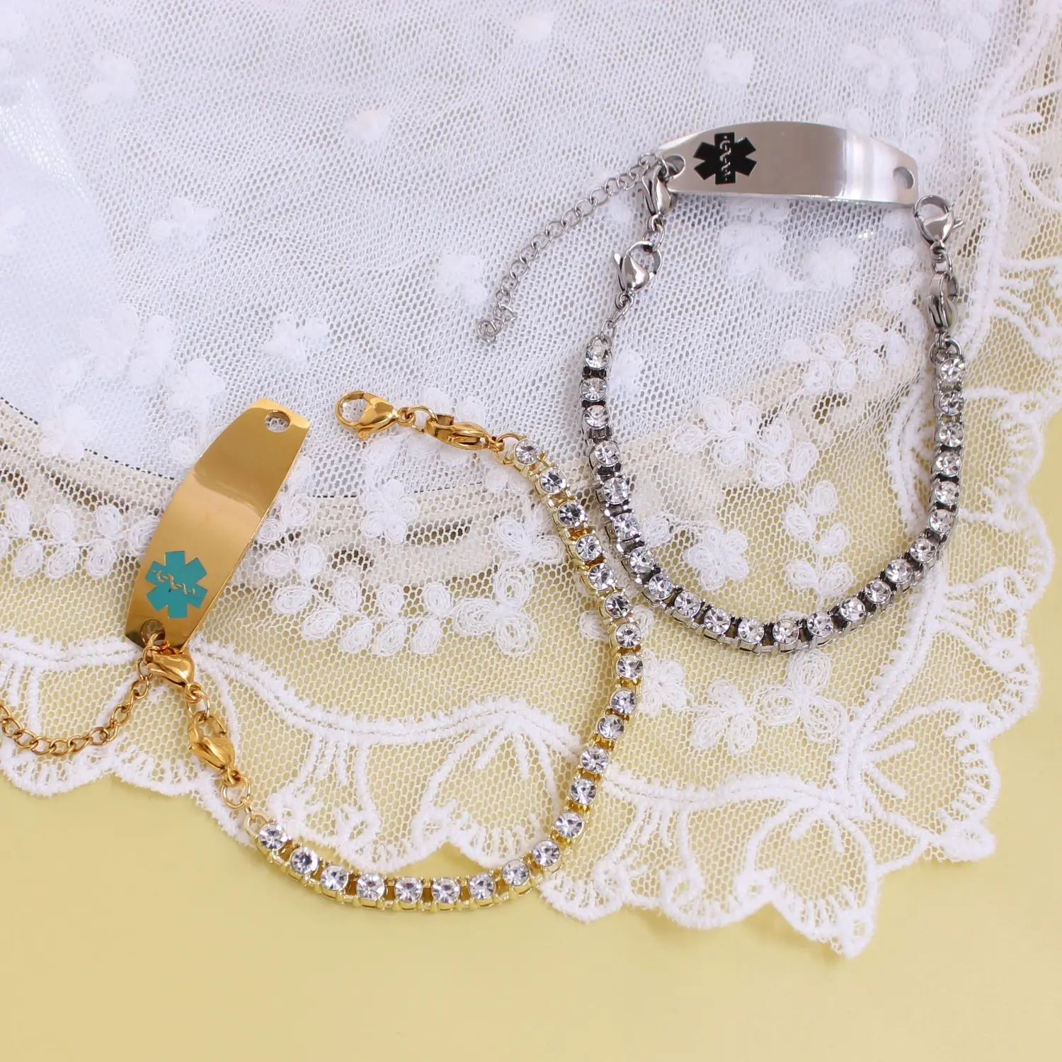 Luxury Rhinestone Design Decorated with sparkling rhinestones and a teal medical symbol, this bracelet looks like a fashionable accessory while clearly indicating medical alert functionality.