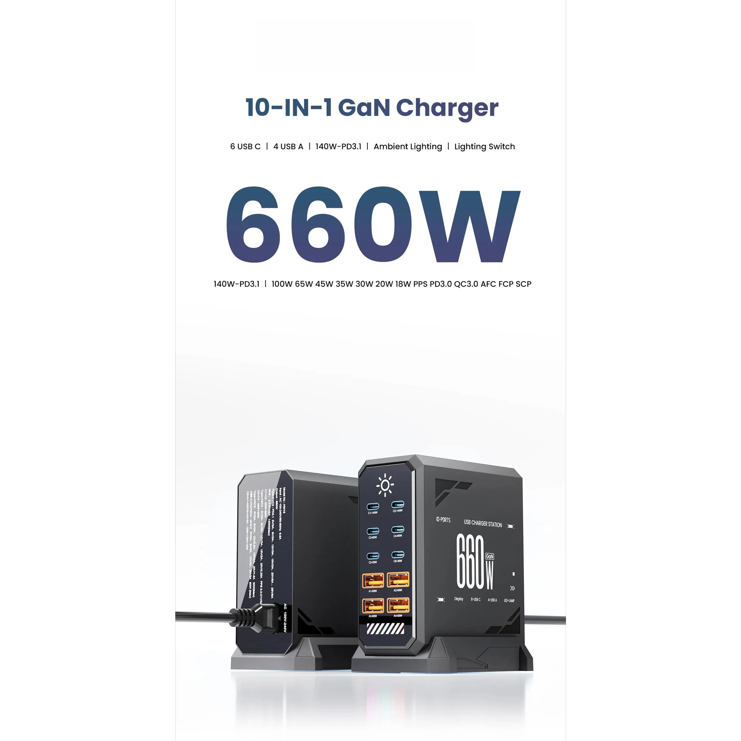 660W GaN USB C Charger Station 10 Port ( 6 Type C + 4 USB A ) Fast Charger Type C 140W PD3.1 PD3.0 PPS Quick Charger For Macbook Pro iPad iPhone 16 Samsun S25 S24 S23