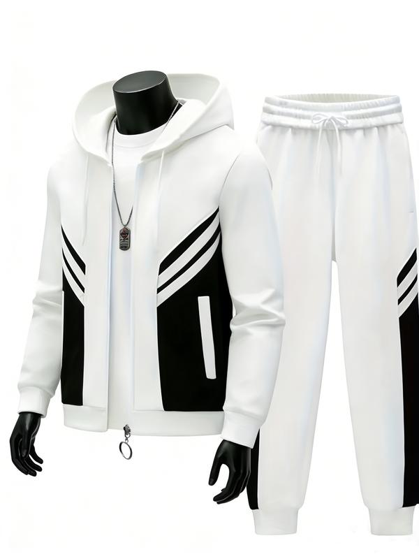 2026 New Men's Hooded Cardigan Two-Piece Set, Black and White Color-Block Striped Set, Zipper Hoodie Top + Jogger Pants, Trendy Patchwork Design, Perfect for Daily Wear, Casual Outings, and Commuting