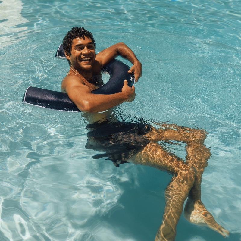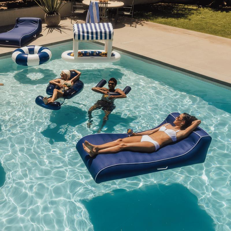Pre-Order Only. This item will ship between 5/18/25 - 5/23/25. Please note: all items in your order will ship together. The most luxurious pool noodle ever! Created with an inner inflatable chamber that is covered in premium fabric, contrast piping and a mesh bottom for easy water drainage. The FUNBOY Fabric Pool Noodle features a unique “U” shaped design that enables multiple in-water floating positions including under arms and saddle style. Mix & match with other items from our navy pool float and inflatable collection here.
