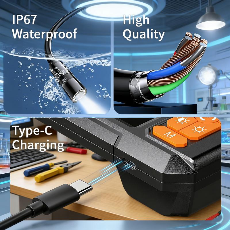 This endoscope camera is perfect for automotive, sewer, and plumbing inspections. Its IP67 waterproof feature makes it suitable for diverse inspection needs. The adjustable LED lights ensure clear visibility in various conditions.