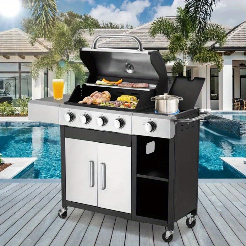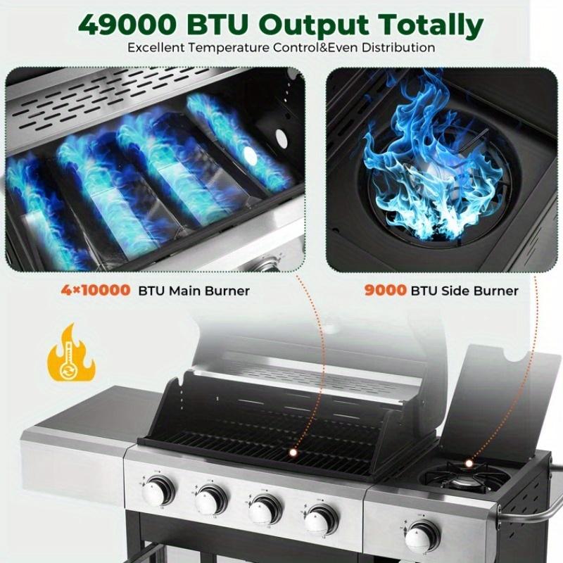 【Superior Cooking Power】This 4-burner gas grill is designed with 4 primary burners, each with 10,000 BTUs, along with a side burner with 9,000 BTUs, providing a total of 49,000 BTUs for strong and even heat distribution. Ideal for searing steaks, grilling vegetables, and simmering sauces all at once.