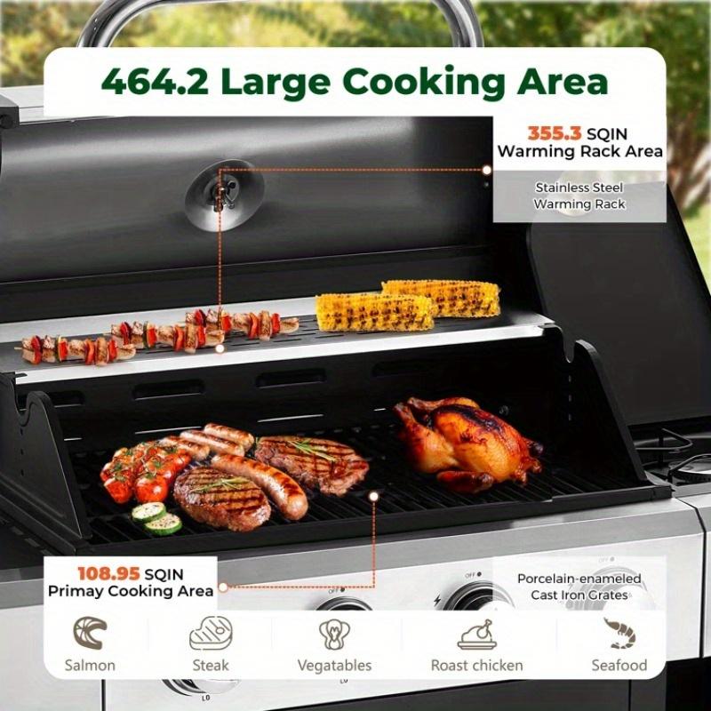 【Large Cooking Area】Featuring a total cooking space of 464.2 square inches, this versatile barbecue grill includes a 355.3 square inches primary grilling area and a 108.9 square inches warming rack area,perfect for defrosting, preheating, and keeping food warm. Whether you're cooking for a small family meal or a large barbecue gathering, you can prepare multiple dishes simultaneously.