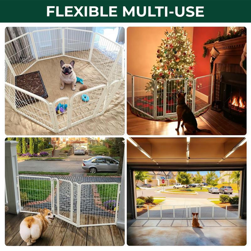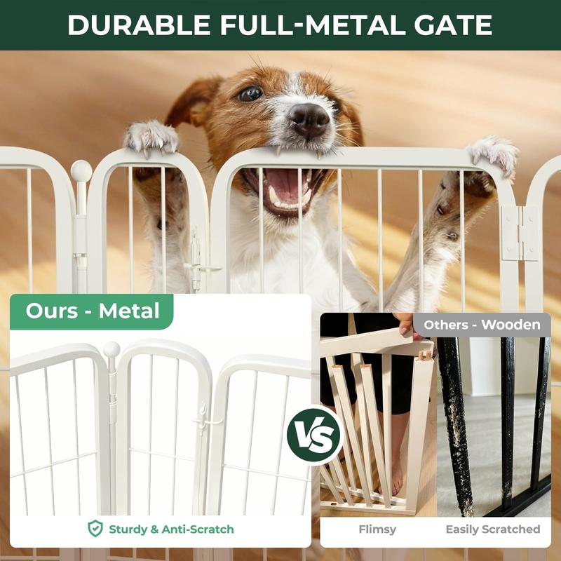 Full-Metal Design with Elegant Aesthetics: The dog gate is made from full-metal material. The accompanying Fence-to-Wall anchors securely fastens the panels to the wall, ensuring a highly stable structure even when set up as a closed-loop play area. Its sleek lines and metallic texture blend seamlessly with a variety of home decor styles, creating a balance of functionality and aesthetics.