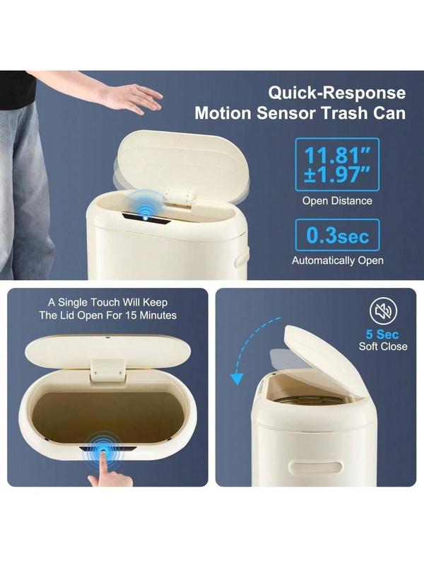Sensor Trash Can: Our motion sensor trash can uses advanced automatic sensing technology, The lid stays open if your hands stay around the infrared motion sensor, which provides a comfortable user experience. When leaving 5 seconds, the lid will automatically close Lid. In cases that You want the lid to stay open, just gently touching open button on the left.