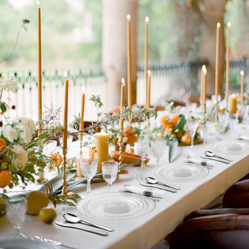 This set includes 350PCS silver rim party tableware, featuring clear plastic plates, cups, and napkins. Perfect for weddings, parties, and anniversaries. The elegant design enhances your event, making it memorable. 🎉