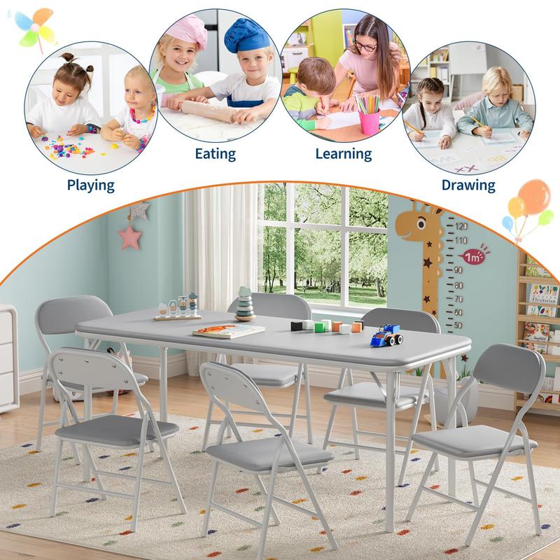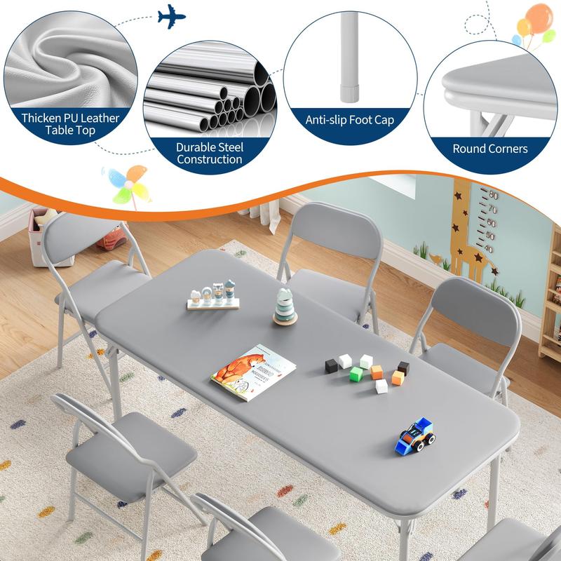 · 【5-Piece Folding Table and Chairs Set】: This folding table and chairs set is designed for kids, featuring a table and six chairs to provide an ideal space for meals, art learning, painting, and games. Crafted with a durable metal frame and thickened PU leather surfaces, it is waterproof, stain-resistant, and easy to clean for long-lasting use. The rounded corner design and anti-pinch structure enhance safety, while the foldable feature saves storage space.