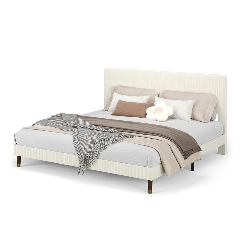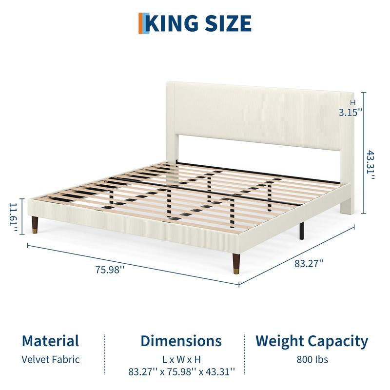 · MODERN KING BED FRAME Features contemporary corduroy wrapped headboard with soft sponge and wing side design for enhanced comfort and mattress security