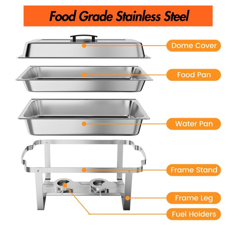 · Complete Accessories Set: This rectangular chafer set for buffet kitchen comes fully equipped with 8 fuel racks (fuel not included), 4 sturdy frames, 4 fuel trays, 4 water trays, and 4 x 9.5QT chafing dishes with lids, providing everything needed for seamless service