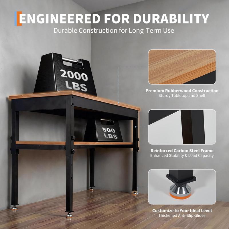· Stable, Heavy-Duty Construction: Work bench features a premium hardwood tabletop designed for long-lasting durability and environmental friendliness. Its reinforced carbon-steel frame supports up to 2,500 LBS, ensuring exceptional stability for demanding tasks.