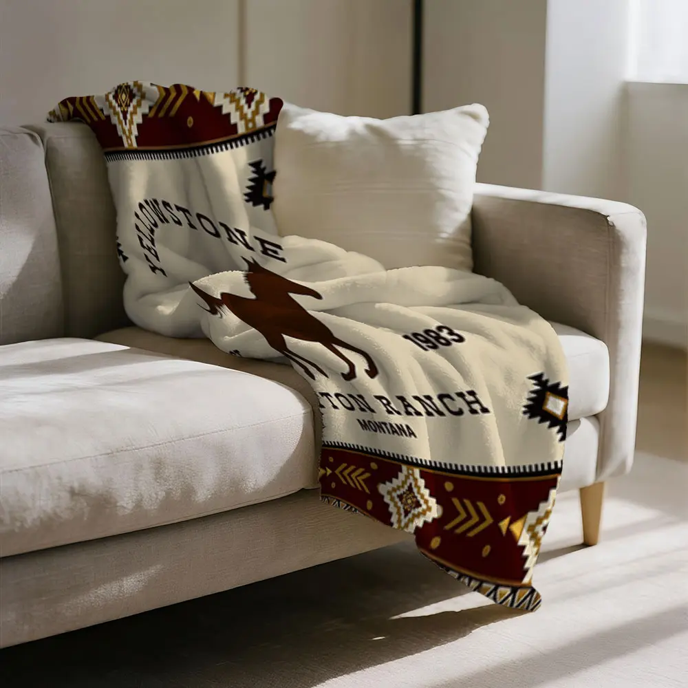 Vintage Southwest Yellowstone Ranch Design Flannel Blanket - Lightweight Soft Four Seasons Suitable, Thick Faux Fur Blanket, Bedroom Floor Blanket, Couple Custom Blanket, Extra Large Sofa Blanket,