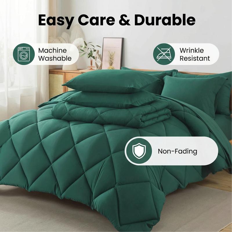 QUEEN COMPLETE BEDDING SET: Package includes 1 Comforter 88"x88", 2 Pillow Shams 20"x26", 1 Flat Sheet 90"x102" , 1 Fitted Sheet 60"x80"+14" and 2 Pillowcase 20"x30"; Our bed in a bag is packaged in a vacuum bag, so you can dry it in low heat or tap the comforter gently while baking it in the sun to fluffy again.