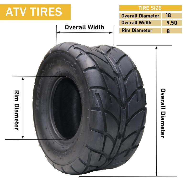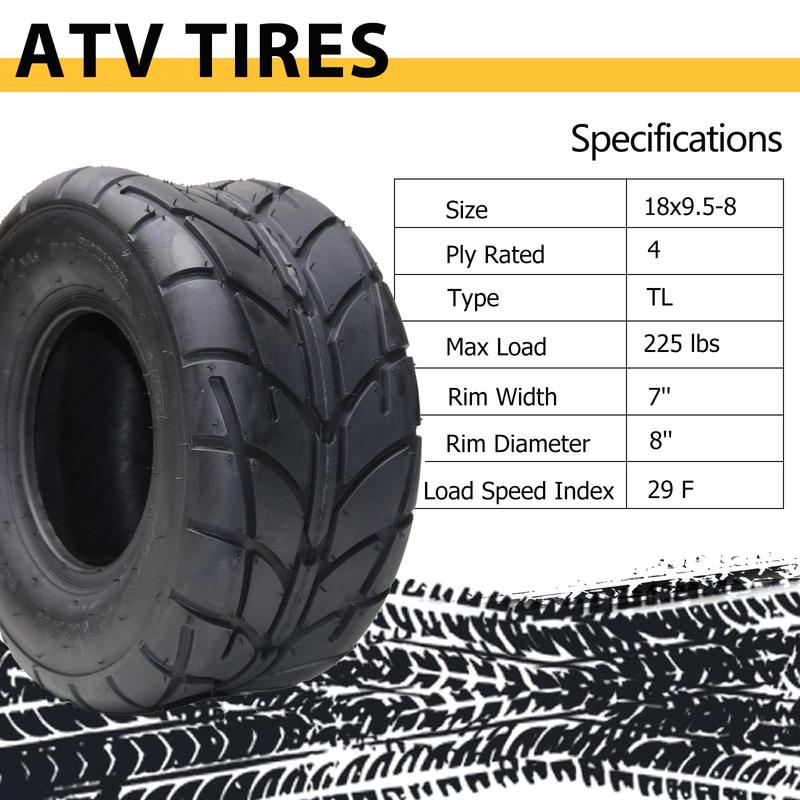 · 【Size】18X9.50-8; Wheel (Rim) Diameter: 8 in; ply rated: 4 ply. Perfectly designed to fit a variety of ATVs and UTVs, providing dependable performance for all your off-road excursions.