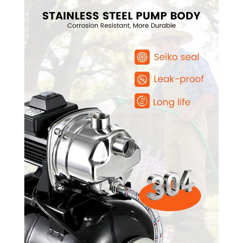 · Corrosion Resistant Durability: Crafted with a 304 stainless steel pump body, this shallow well water pump resists rust and corrosion for lasting reliability. Rest assured your jet pump is built to withstand the elements and deliver trouble-free operation year after year