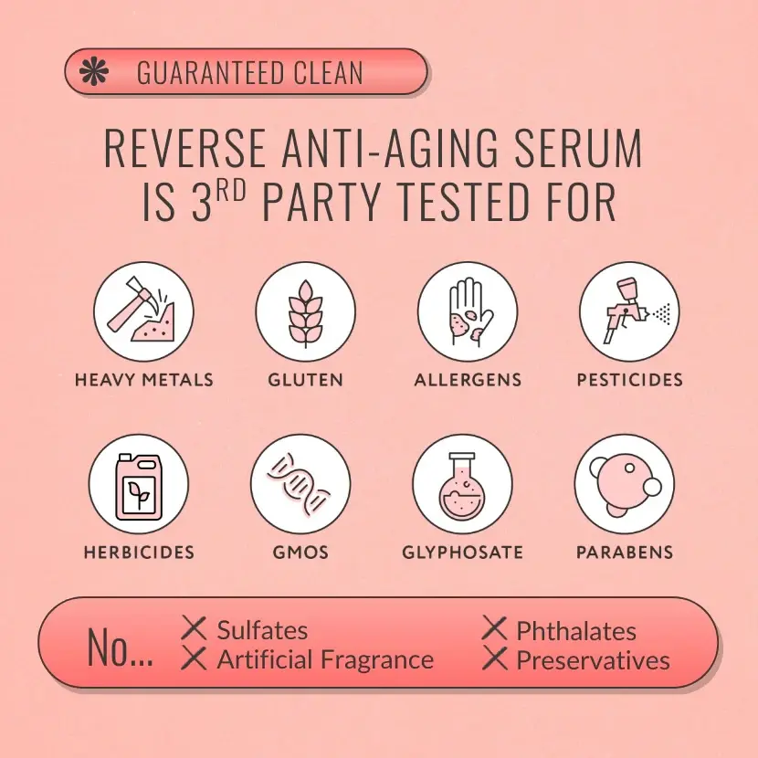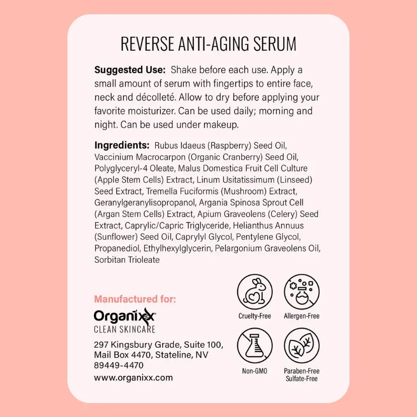 Reverse was scientifically formulated to flood the layers of your skin with natural, clean, and pure ingredients that support cellular structure and promote a luminous, smooth, and even-looking complexion. This anti-wrinkle serum is built on the perfect two-nutrient combination of organic tremella mushroom and argan plant stem cells, combined with patented anti-aging ingredients and nourishing skin oils rich in healing antioxidants. Reverse penetrates beyond the skin's surface and works at a cellular level to keep skin hydrated and radiant, while minimizing wrinkle depth and appearance.