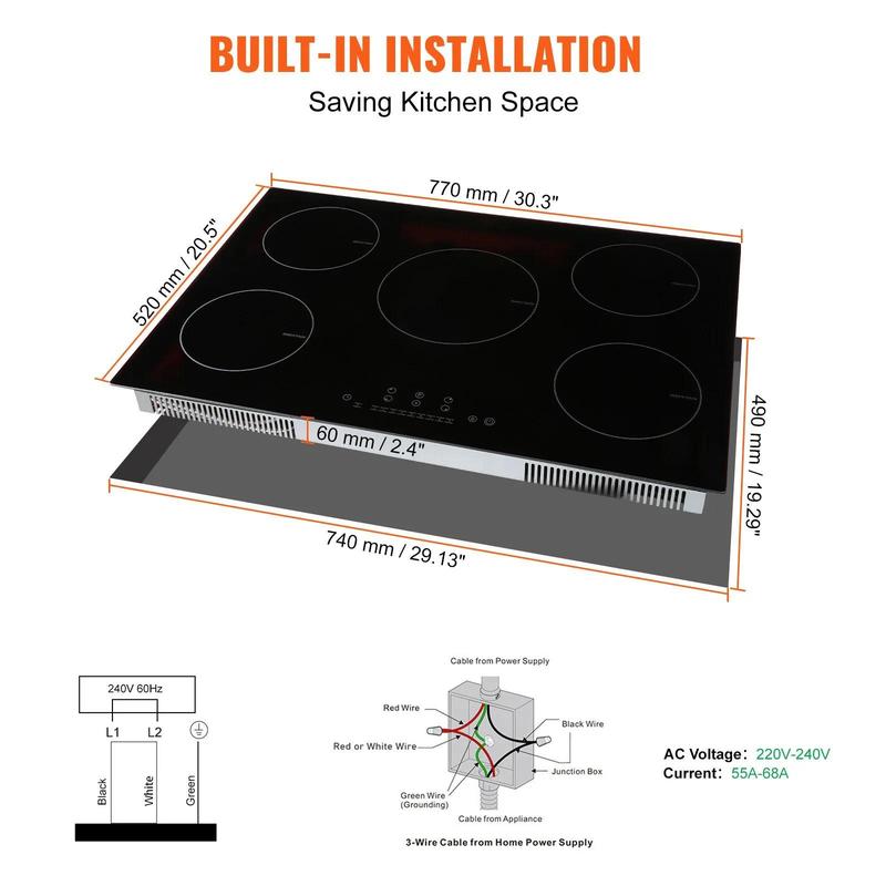 ·The 30-inch induction cooker is designed for built-in installation, saving kitchen space and easy to install.