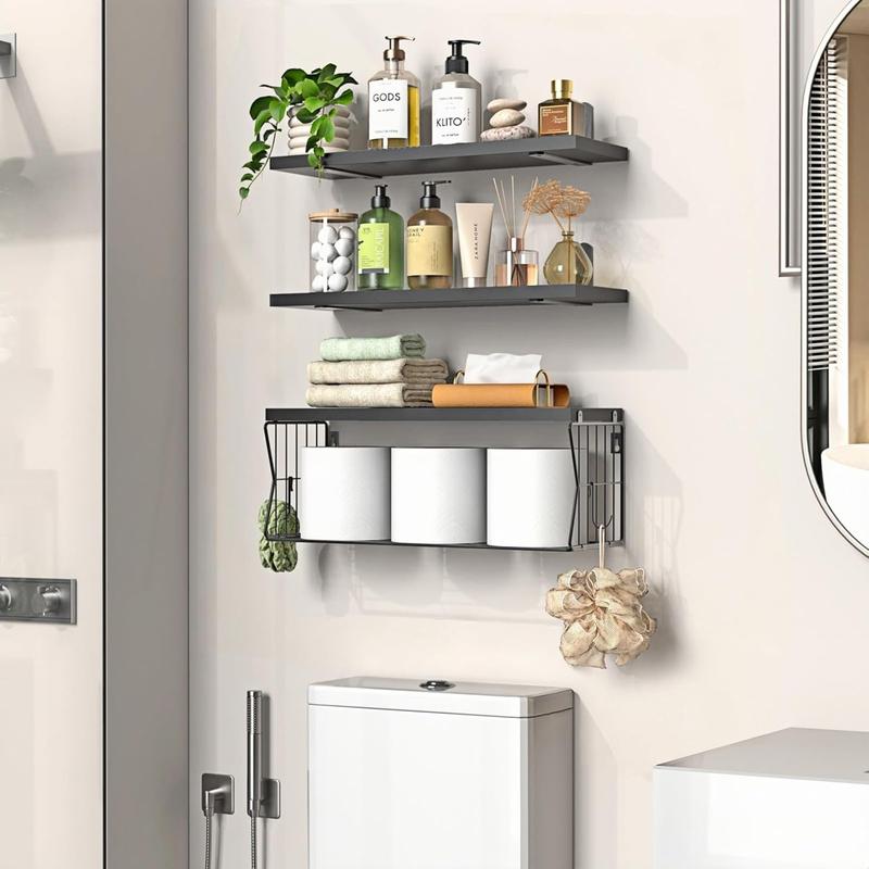 5. Floating Bathroom Shelves Wall Mounted, Set of 3 Wooden Shelves with Metal Basket, Over Toilet Storage Organizer for Bathroom, Apartment, RV, Powder Room, Black