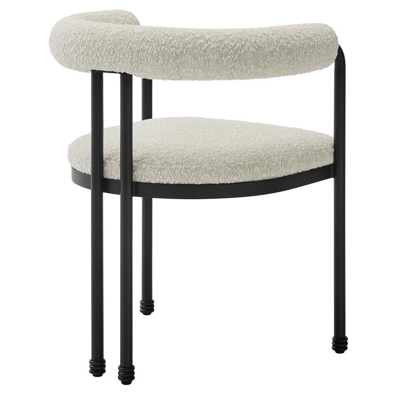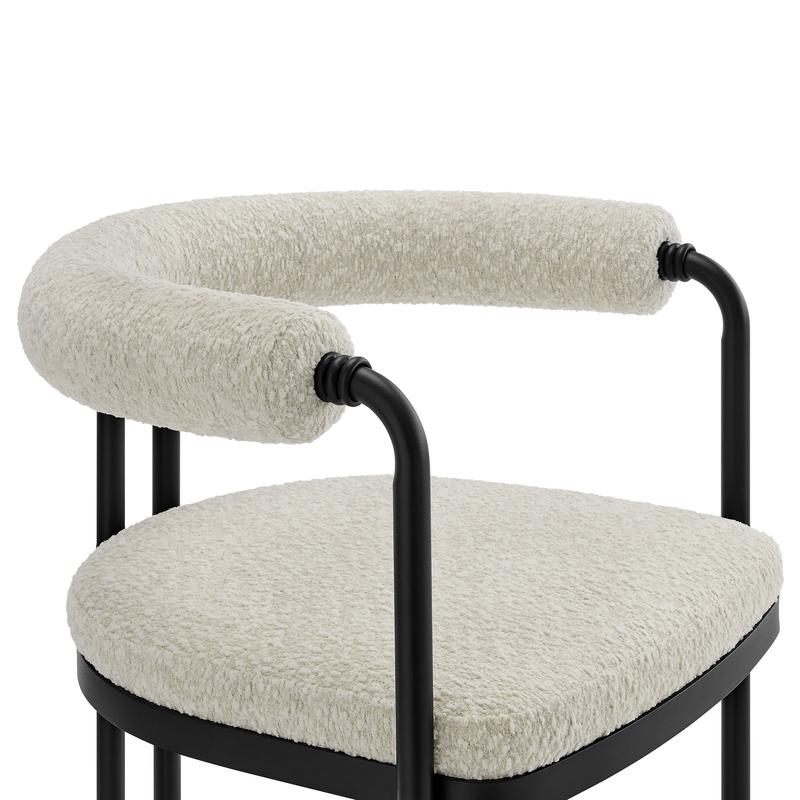 Bringing an artful modern vibe to your space, the Turin Curved Back Dining Chair boasts a sculptural silhouette and inviting design. Featuring a rounded, open frame with a padded rolled backrest, this inspired barrel chair blends bold shapes with soft textures for a look that’s both contemporary and sophisticated. Upholstered in boucle fabric, this metal accent chair adds cozy texture and luxurious depth to any room. Its powder-coated metal frame offers a clean, streamlined aesthetic while ensuring lasting durability. Perfect as a dining armchair, accent chair, or desk chair, Turin’s unique design elevates any setting from the living room to the dining room. With non-marking adjustable floor glides and no assembly required, this barrel chair with open back makes stylish living effortlessly easy. Weight Capacity: 300 lbs.