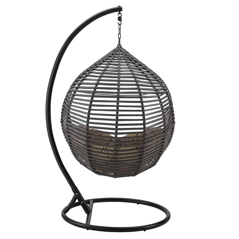 Calmly sway back and forth from the secure comfort of the Garner Teardrop Outdoor Patio Swing Chair with Stand. This stylish modern outdoor hanging chair comes with a durable powder-coated steel frame wrapped in a long-lasting PE wicker rattan weave, hanging steel chain, and steel stand. Complete with a soft all-weather tufted polyester fabric cushion, this versatile hanging chair is a welcome update to your deck, porch, patio, or inside your home as a fun swing chair for the bedroom or living room. Enjoy a relaxing seating experience from the comfort of this teardrop hanging chair with steel stand. Chair Weight Capacity: 265 lbs.