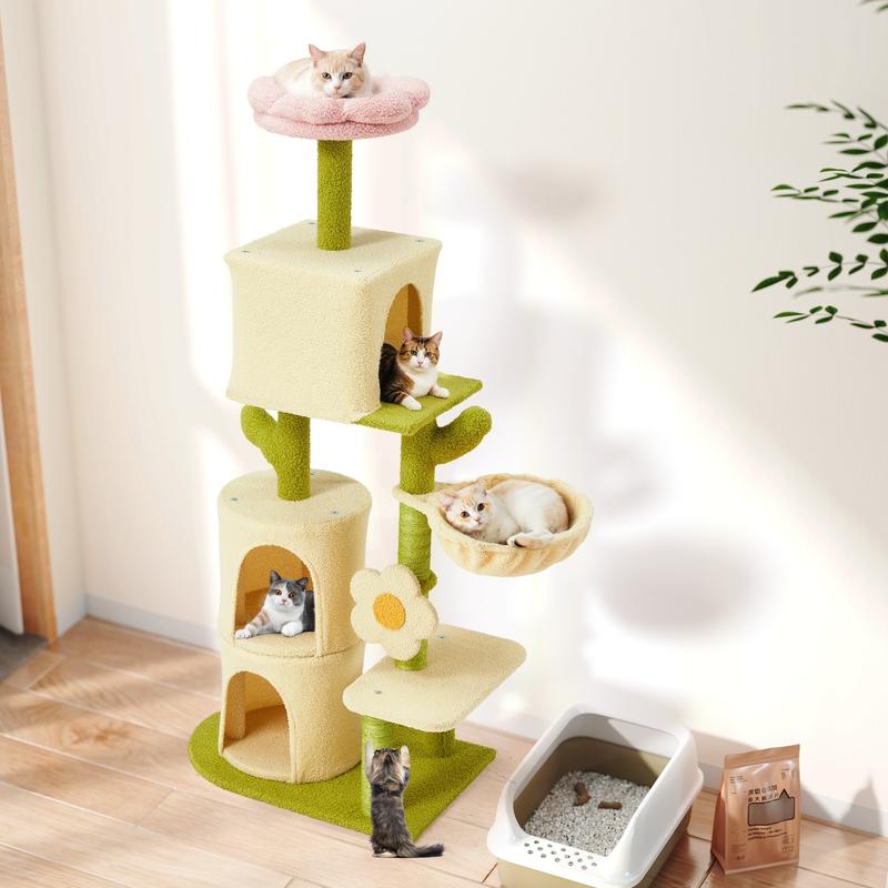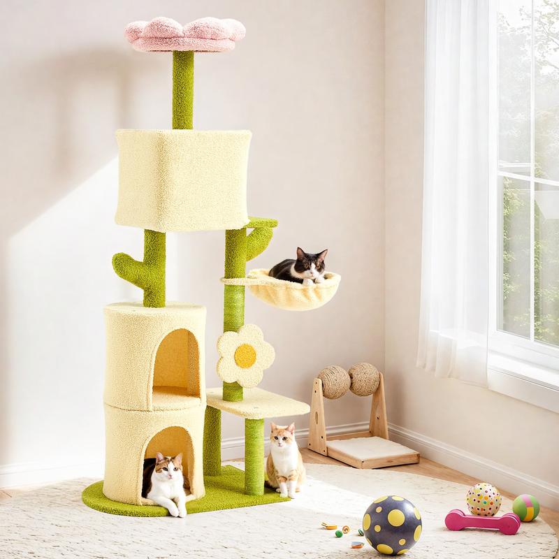Designed with multiple levels, this indoor cat tower offers various heights and activity zones for climbing and exploration. From two spacious condos and open platforms to a cozy teddy fleece hammock and a flower-topped perch, your feline friend will enjoy endless opportunities to play, rest, and relax.