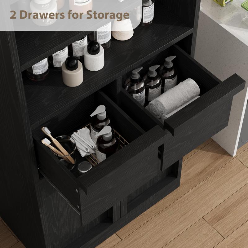 · 【Ideal Space Savers】Measuring 23.6"L × 11.8"D × 50.9"H, this tall bathroom storage cabinet offers ample storage space with well-designed open shelves and 2 drawers and 1 enclosed cabinet personalize the storage space to meet your growing toiletries needs. Toiletries, toothbrushes, cleaning products, shower gel and other personal supplies can all be accommodated.