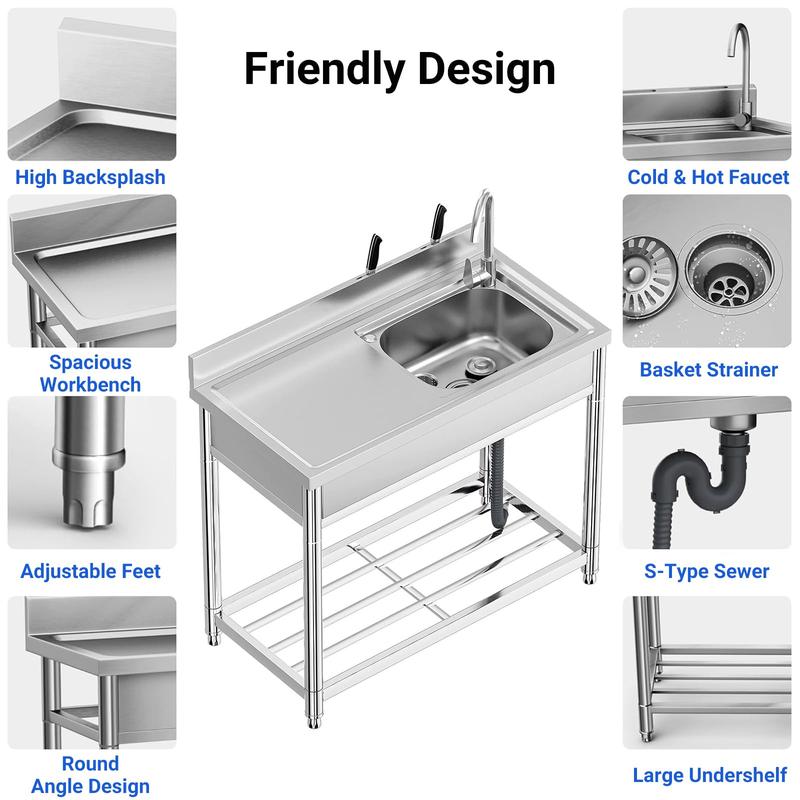 · Premium Stainless Steel Construction: Made with a 201 stainless steel sink body and a 304 stainless steel faucet, this utility sink is built for long-lasting durability and can handle heavy daily use in kitchens, laundry rooms, garages, and more.