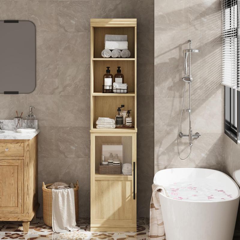 · Space-Saving Bathroom Storage Solution:Maximize small bathrooms with this 70.3-inch tall narrow storage cabinet (15.7"W x 14"D), designed for tight spaces like toilets, showers, or vanities. The 3-tier open shelving + tempered glass door combo offers quick access to toiletries, towels, and cleaning supplies while keeping dust out. Fits perfectly beside sinks or in laundry rooms