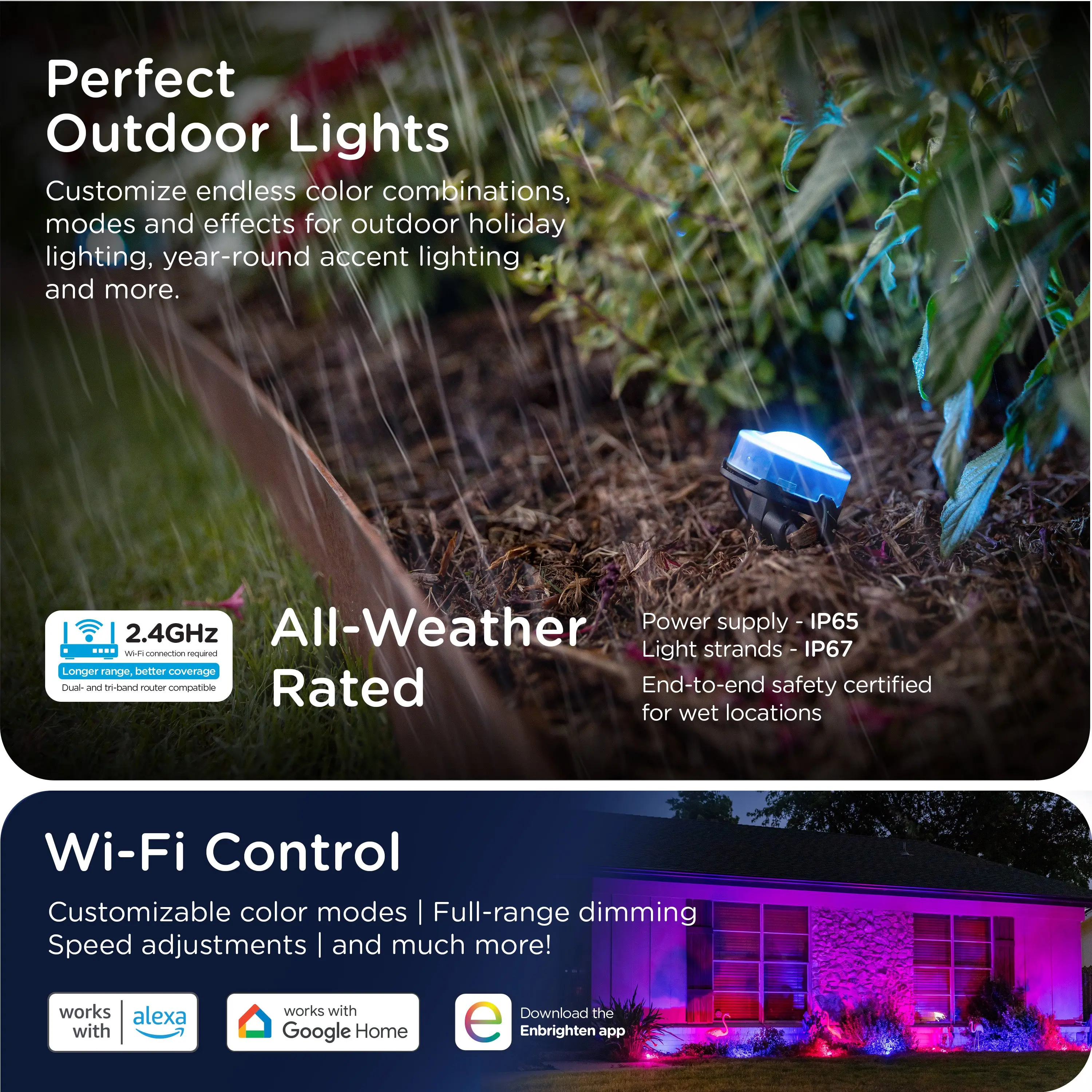 Each system offers expansive color combinations, dynamic lighting modes and customizable effects controlled through the free Enbrighten app on iOS and Android. Intuitive control makes it easy to change moods, schedule scenes and fine tune your outdoor space in seconds.