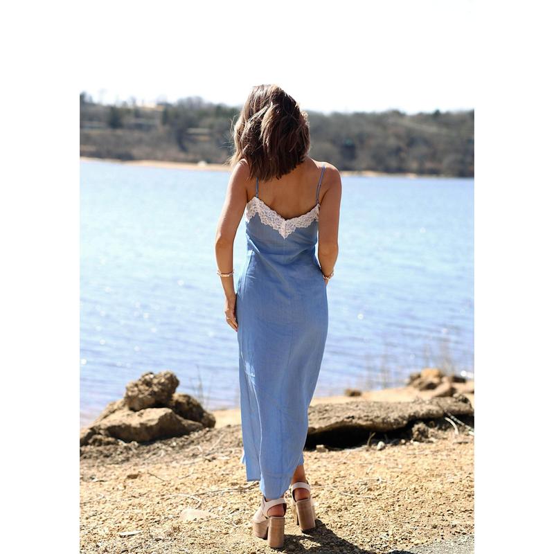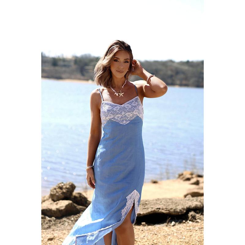 Our Chambray Lace Midi Dress is effortlessly elegant with a side zipper and adjustable spaghetti straps providing a perfect fit. Lace detailing adds a touch of romance to the front slit and bust. With a flattering v neck, this dress is both chic and comfortable.