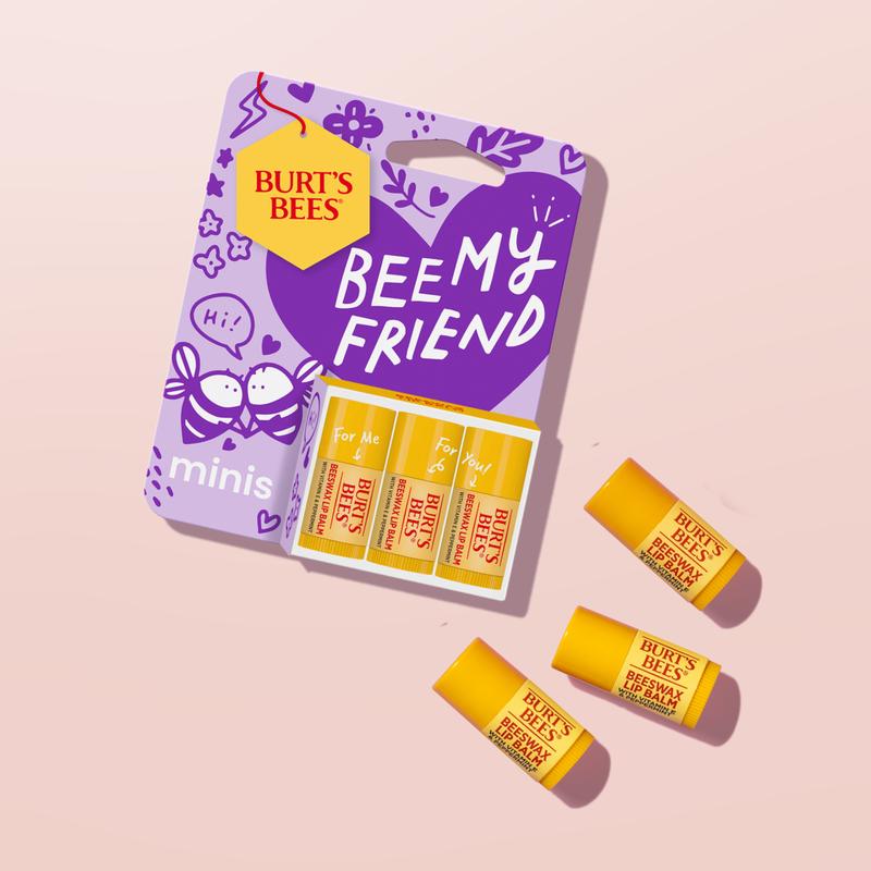 This Burt’s Bees Bundle includes the Bee My Friend Mini Beeswax Lip Balm Set, Bee Mine Mini Lip Balm Set, and Bee My Galentine Mini Tinted Lip Balm Set. This bundle includes a fun mix of Beeswax and Tinted Lip Balms and is the perfect little Valentine's Day gift for friends, Valentines, or Galentines! The tint-free Beeswax Lip Balms nourish lips with 24 hours of moisture, while the Tinted Lip Balms provide eight hours of moisture and a hint of color to keep lips soft and glowing. It's easy to apply this moisturizing lip balm anytime, anywhere with no mirror needed.