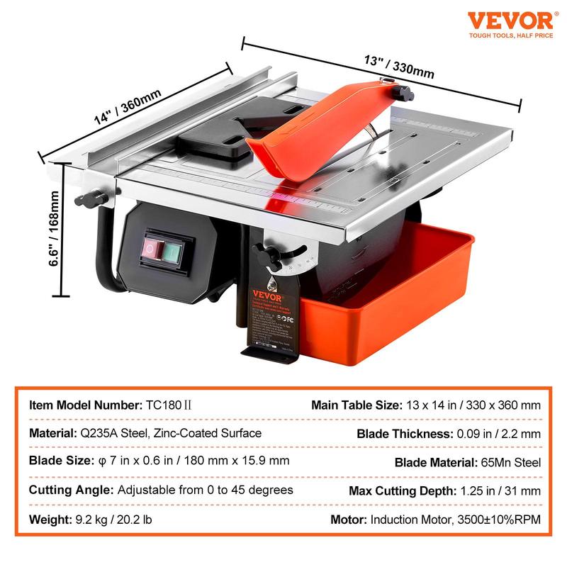 • 0-45° Angle and Deep Cutting: The VEVOR wet tile saw provides adjustable cutting angles from 0 to 45 degrees. The maximum cutting depth is 1.25 inches / 31 mm. Equipped with a thick 65Mn steel blade and a high-speed 3500 RPM induction motor, it can effortlessly cut various tiles, stones, and ceramics.