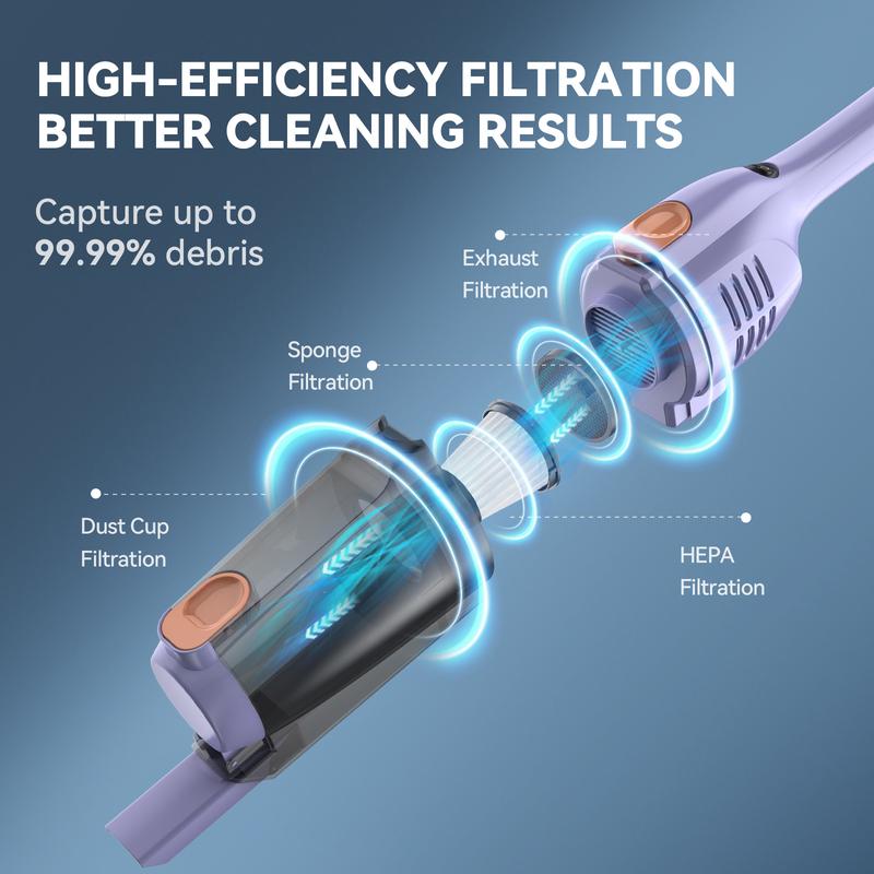 This lightweight vacuum cleaner captures up to 99.99% of microparticles and releases cleaner air, helping you maintain a healthy home environment for your family. Regular cleaning or replacement of the HEPA filter ensures optimal suction power. (Please always use the vacuum cleaner with the filter installed.)