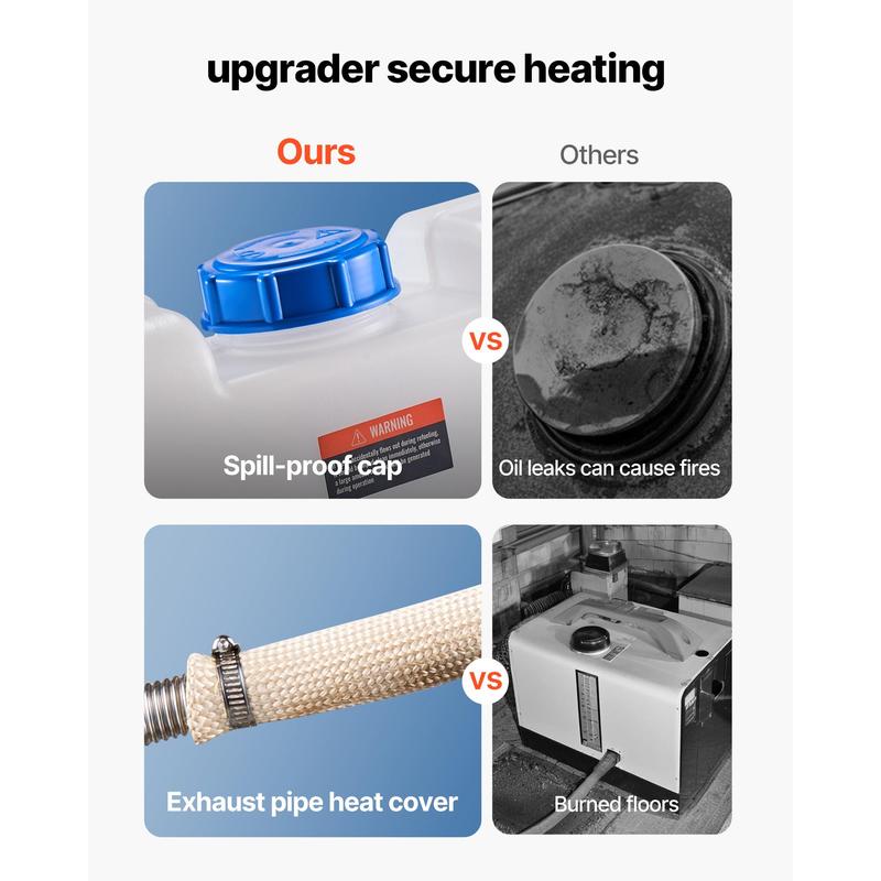 • Security Features: This diesel air heater features exhaust pipe heat sleeve to reduce floor damage risks. The sealed fuel cap ensures secure long-term use. Built-in protections include overheat shutoff (≥536℉), reverse polarity, and overvoltage