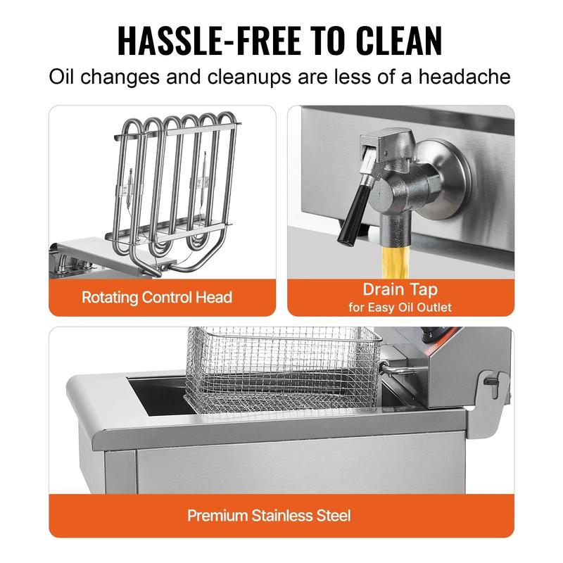 Easy Cleaning 🧼- Flip-Up Heating Tube: Facilitates easy cleaning- Stainless Steel Exterior: Easy to wipe down- Front-Mounted Drain Valve: For effortless oil release