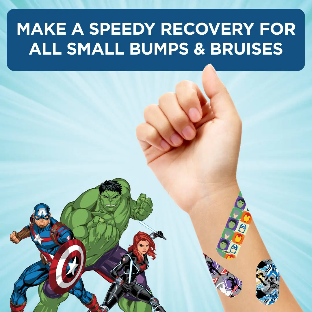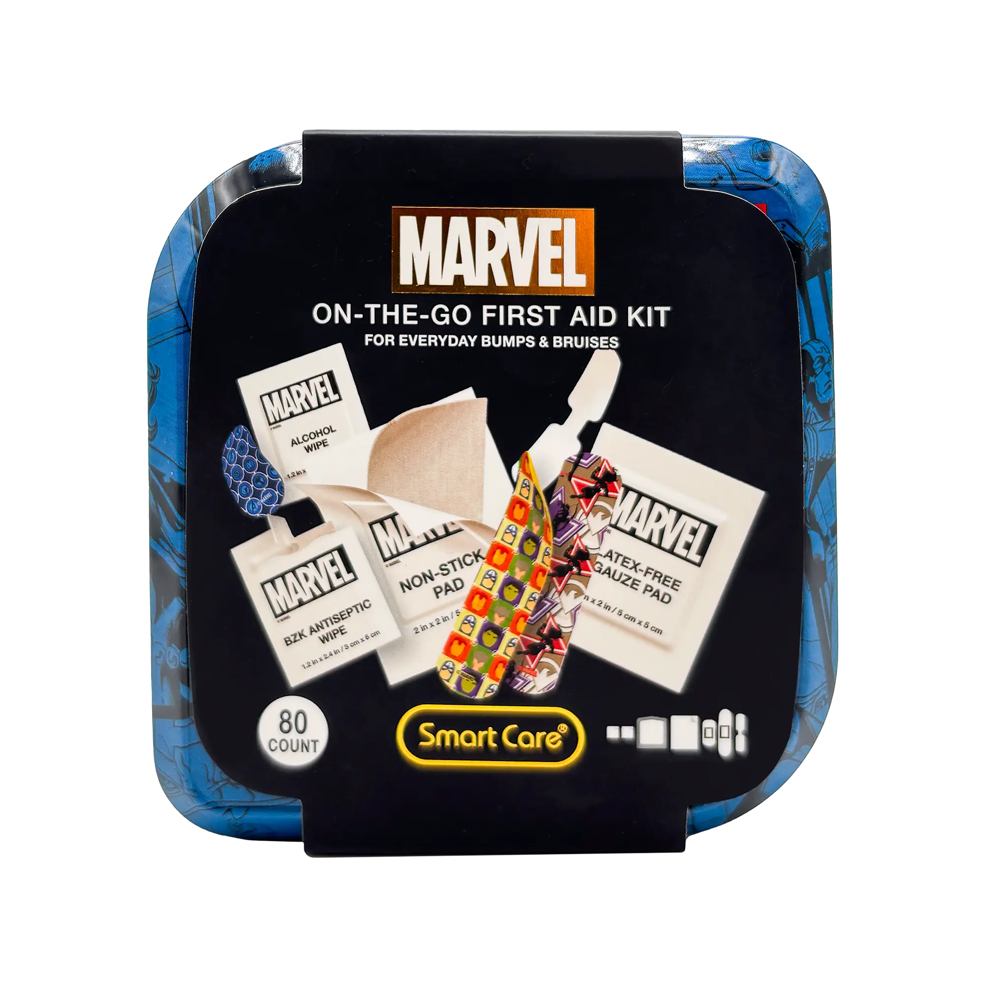 Smart Care Marvel On the Go First Aid Kits keep you covered... literally! Each kit includes 24 bandages, 4 antiseptic wipes, and 4 latex-free gauze pads. With a convenient storage tin, you're covered at home and on-the-go. Use the antiseptic wipes to clean minor cuts and scrapes! The assorted bandages feature two fun Marvel designs to keep your skin protected.