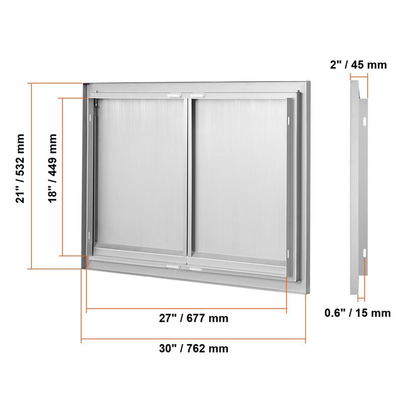 • Precision Opening: Overall dimensions: 762x532x45 mm / 30x21x2 inches, installation size: 27x18inch/677x449mm, it is recommended to reserve an additional 0.08inch/2mm on this basis for better operation. The door is designed specifically for outdoor kitchens and barbecue islands, adding an elegant touch to your cooking area. With precise dimensions, it is easy to process, install, or dismantle. Available in various sizes and styles, it is perfect for indoor/outdoor kitchens and all other outdoor weather conditions.