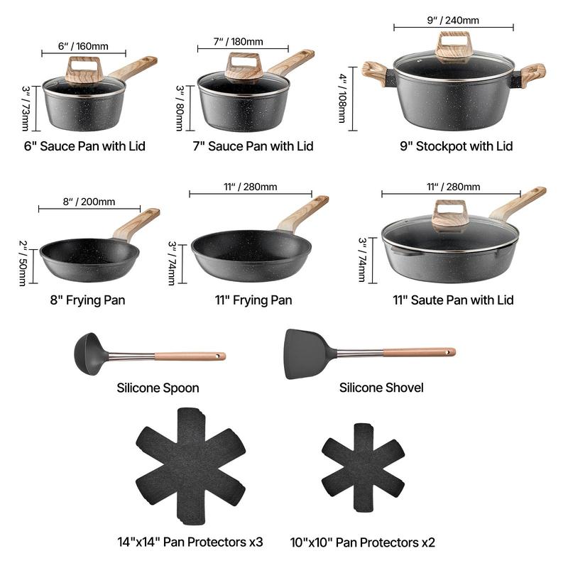 • Versatile Set: This 17-piece set includes a 6in sauce pan, 7in sauce pan, 8in frying pan, 11in frying pan, 11in saute pan, 9in stockpot, 2 10x10in pan protectors, 3 14x14in pan protectors, silicone spoon, and silicone shovel. Perfect for various cooking needs.