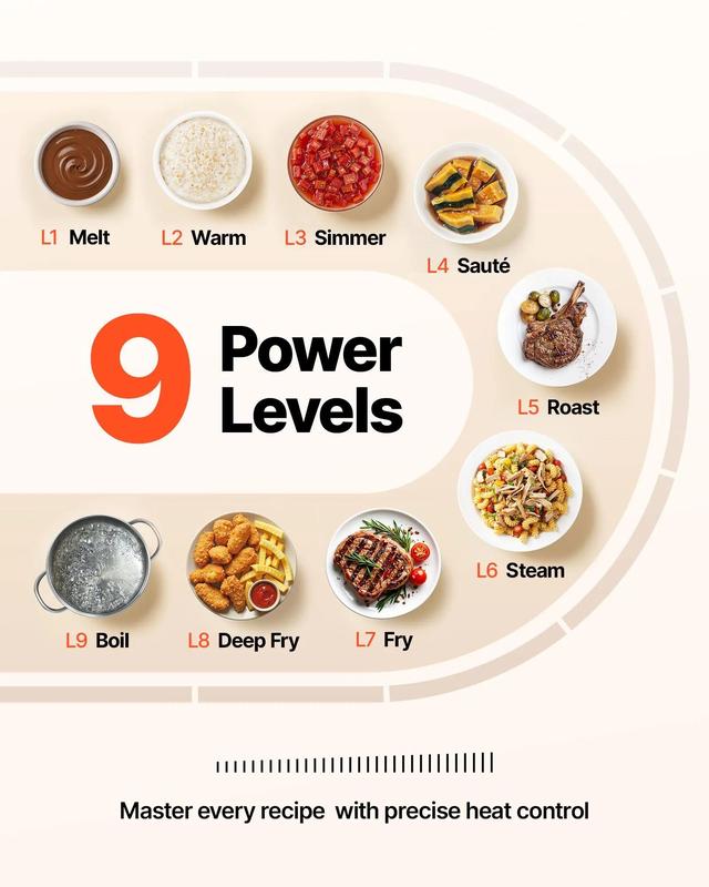 Digital Sensor Touch Controls 📱- 9 Heating Power Levels: Precise control from boil to simmer.- Timer: 1-99min timer for easy and enjoyable cooking.- Sensor Touch Panel: Ideal for accurate cooking effects.