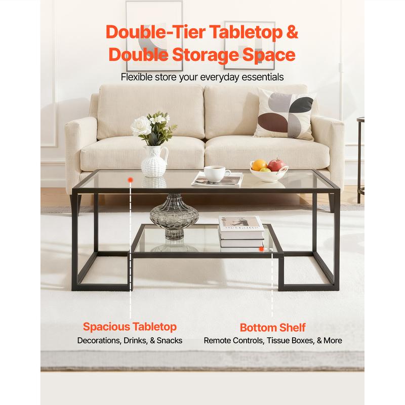 • 2-Tier Design: Featuring ample tabletop space, the coffee table easily holds books, water cups, laptops, and snacks for convenient access. It adds a lower storage space at the bottom to store daily small items, improving storage efficiency