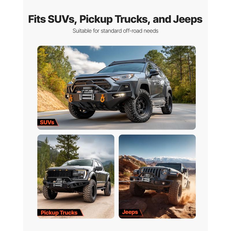 • Wide Compatibility: The universal mounting pattern fits most SUVs, pickups, and Jeeps. The recovery winch set includes fairlead, hook, and power cables—ready for fast setup and use.