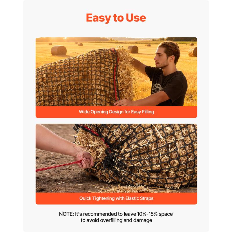 • Large Capacity: Measuring 5.91 x 5.91 x 5.91 ft, this round bale hay net holds 1800-2200 lbs of hay, including alfalfa and timothy bales. Wide opening allows easy filling, and adjustable straps secure the feed, ensuring efficient feeding for livestock