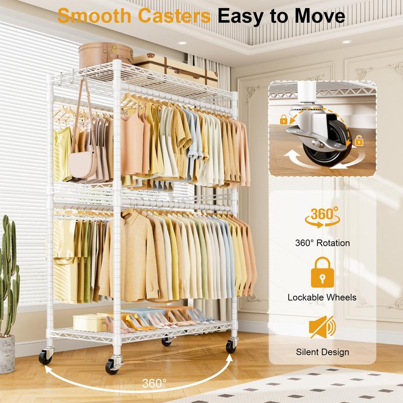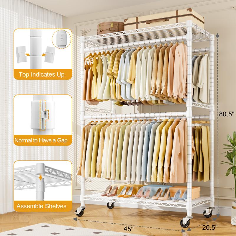 P4 Plus ULIFHOME Rolling Clothing Racks for Hanging Clothes, Heavy Duty,  Free Standing Garment Racks with Wheels, Portable Closet Rack 45''W × 20.5''D × 80.5''H, Max Load 570 Lbs, White