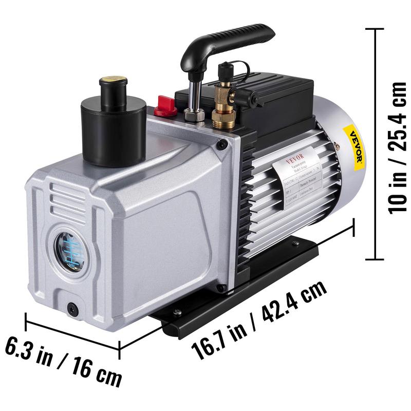 • Heavy Duty Vacuum Pump: FAD: 12 CFM, Single Stages; Power: 1 HP; Ultimate Vacuum: 5 Pa. Our HVAC vacuum pump comprises heavy-duty aluminum alloy with durability and sturdiness. The strong copper motor provides continuous power, and a shock-proof base supports the stable operation.
