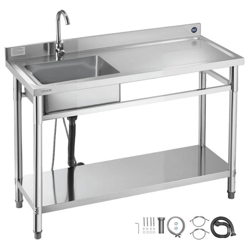 VEVOR Stainless Steel Utility Sink, Free Standing Single Bowl Commercial Kitchen Sink with Faucet, Utility Right Basin Workbench with Hot & Cold Water Pipe for Garage Restaurant Laundry, 47x19.7x37 in