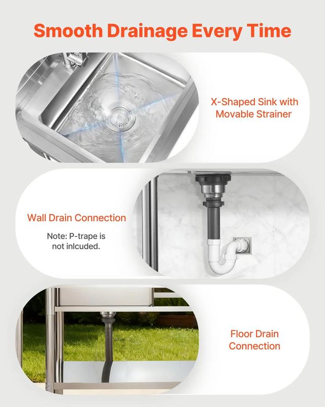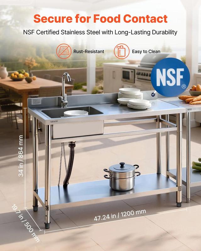 Ideal for outdoor kitchen, patio, garage, bar, restaurant, or buffet. The commercial sink features adjustable feet for balance on uneven ground. Dimensions: 47x19.7x37 inches.