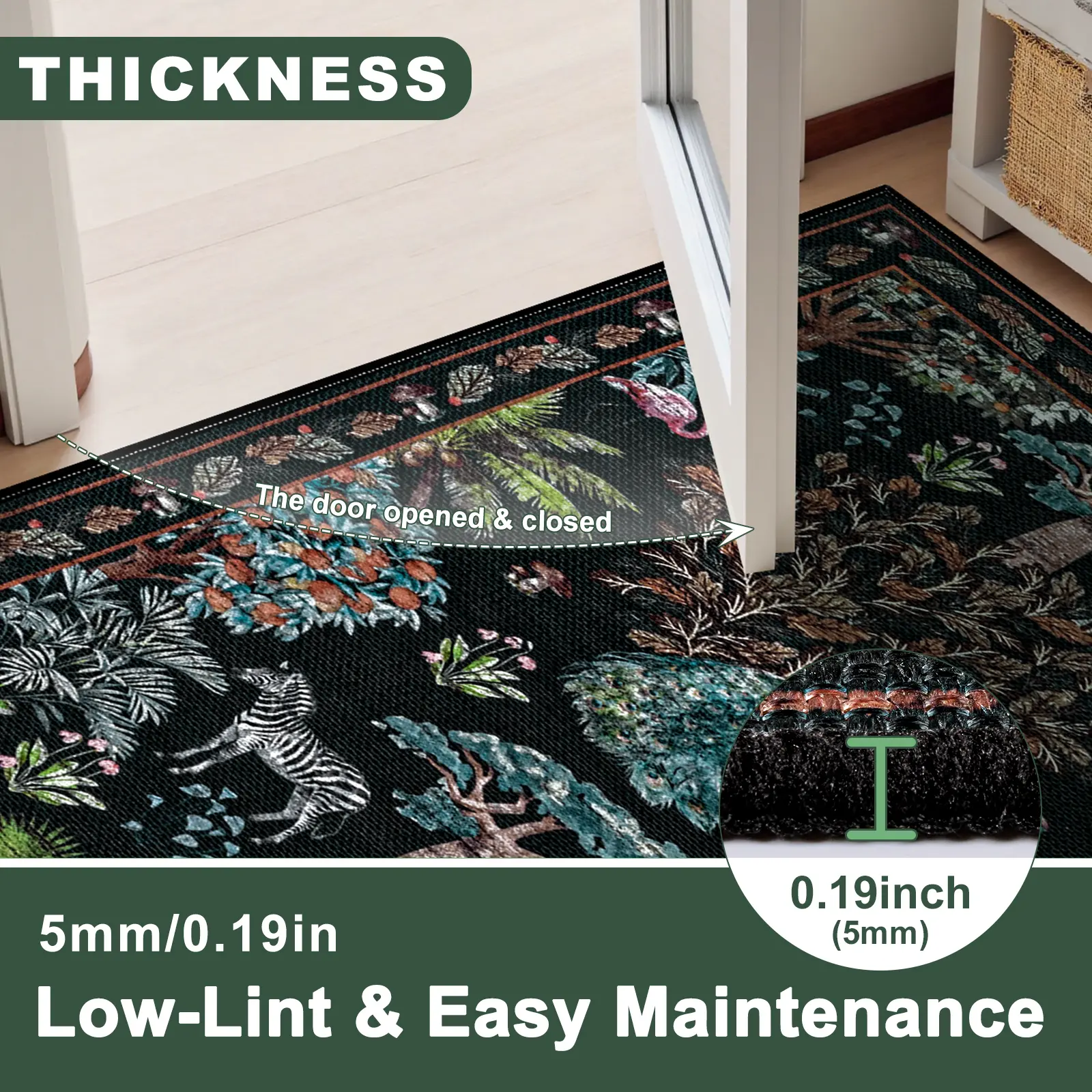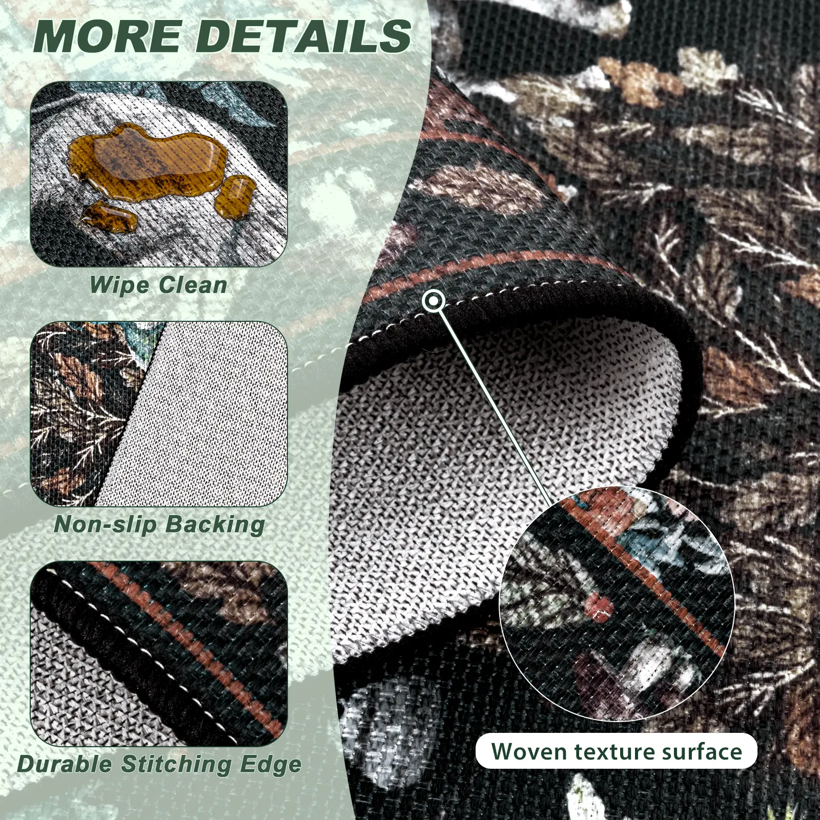 Kids and Pets Friendly: This forest rug is designed with a 0.2 in ultra-thin short pile, food debris and hair will not be embedded. Ideal for high-traffic areas. No more worries about unforeseen messes caused by children and pets.
