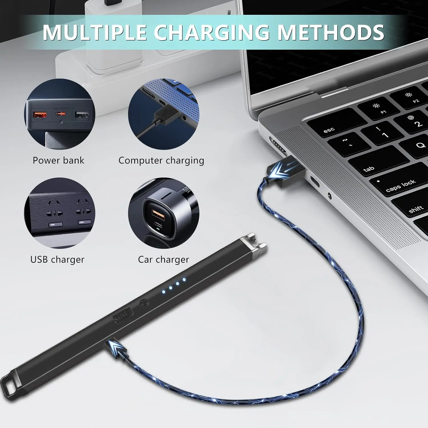 ·Large Capacity, Long Battery Life, and Worry-free Fast Charging - This electric candle lighter is equipped with a large-capacity built-in battery, which can easily meet the needs of long-term outdoor travel, hiking and camping, or daily high-frequency use. The handle is equipped with 4 LED indicators, which can clearly indicate when the battery is low. The included USB charging cable is compatible with various devices such as power banks, laptops, and car chargers.