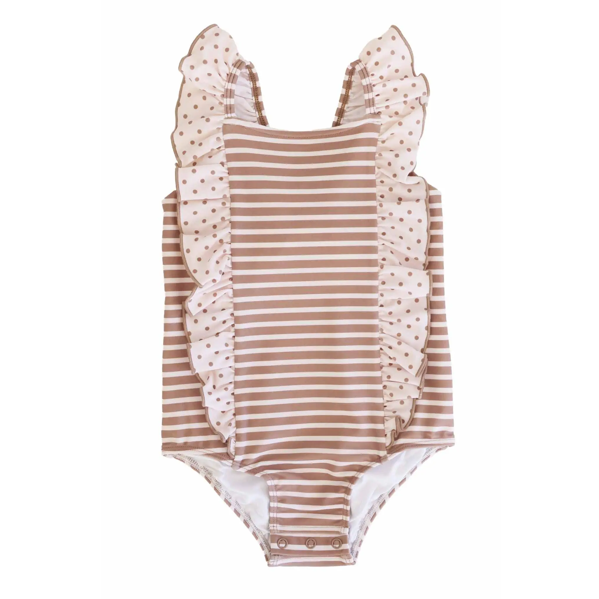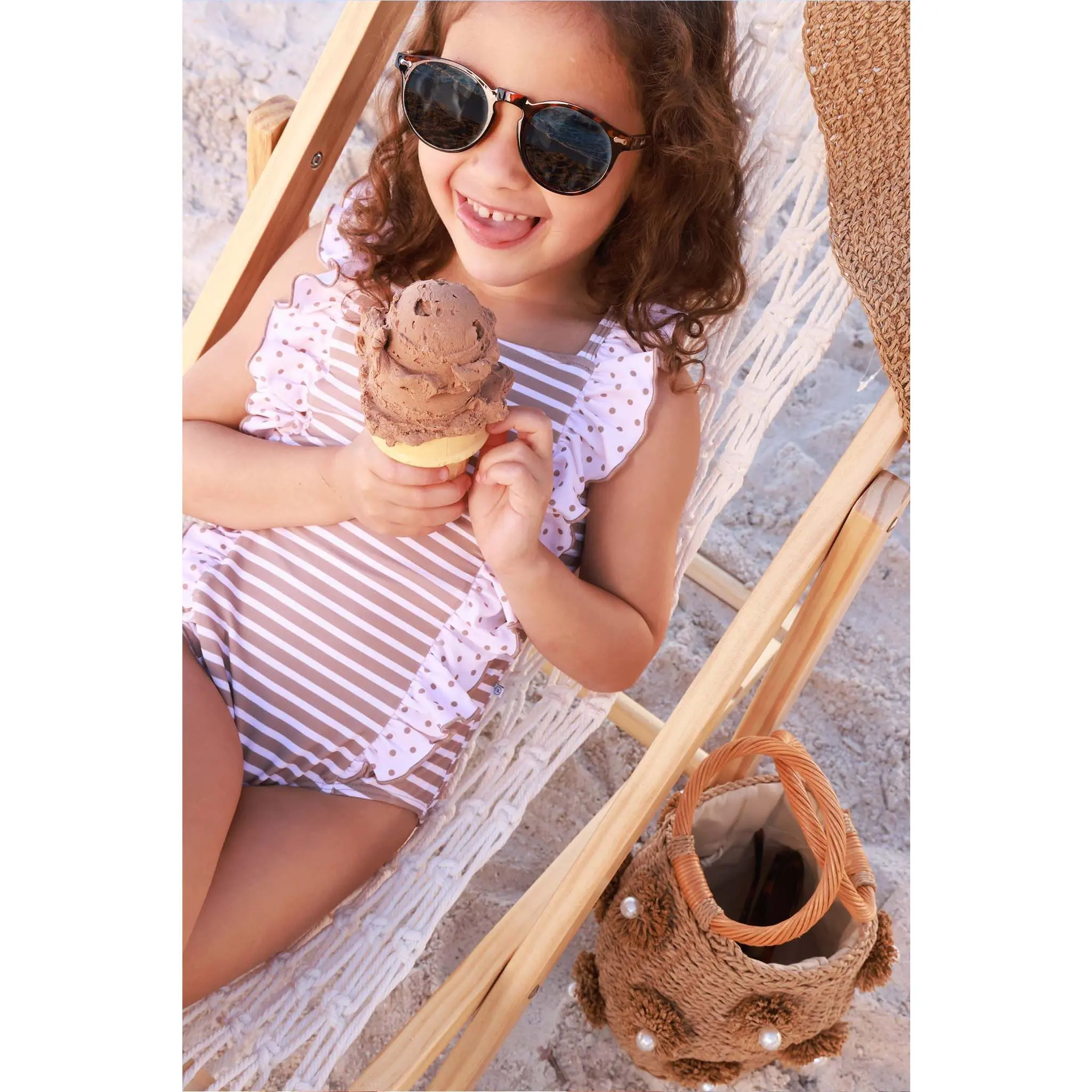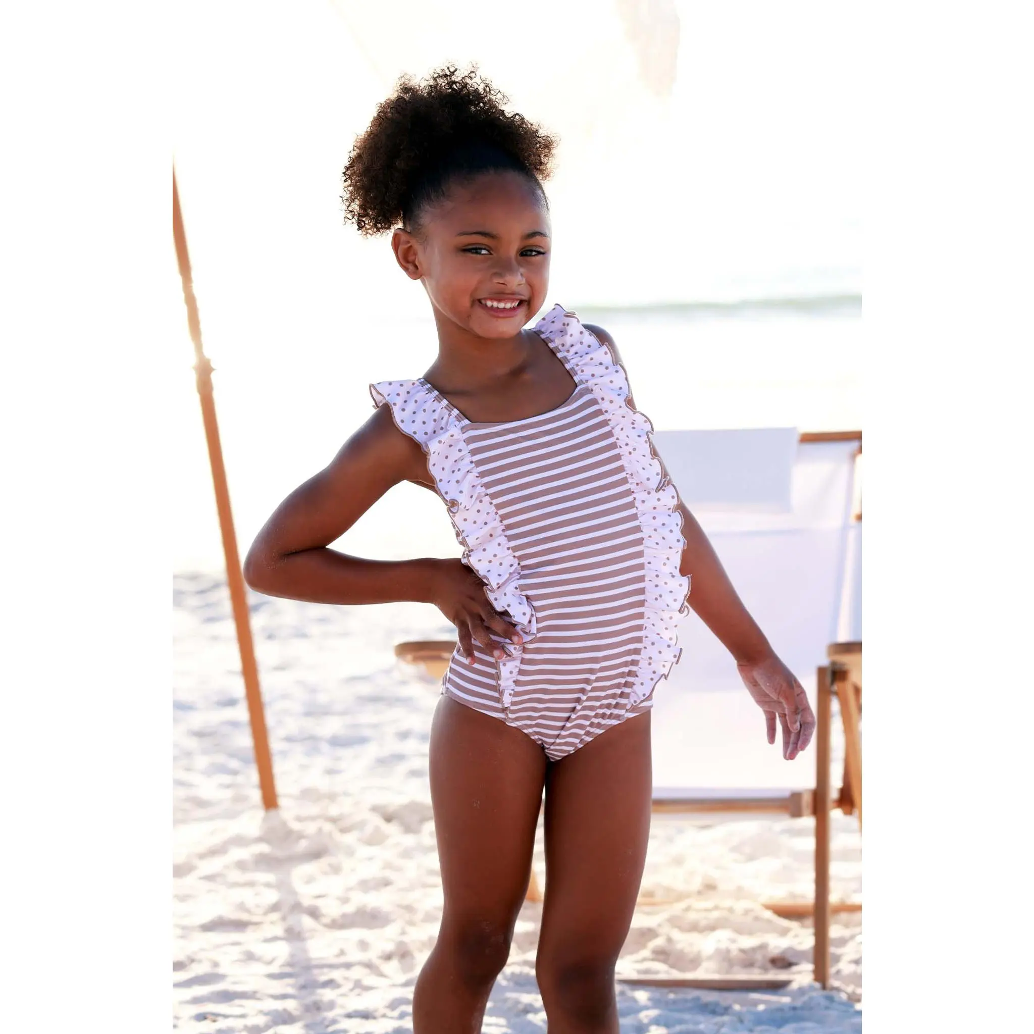 The Sandy Stripes Double Ruffle Bow Back One Piece is made for little beach days that turn the beach into her own little runway. Part of our family matching swim collection, it features neutral stripes with polka dot accents and the sweetest double ruffle detail that brings just the right amount of girly fun. The showstopper is the bow back, a statement detail that feels extra special while still being easy and comfortable for all-day wear. With a classic one-piece fit that stays put for splashing and playing, it’s the perfect pick for matching with siblings and parents in the Sandy Stripes lineup for a summer full of family matching cuteness.